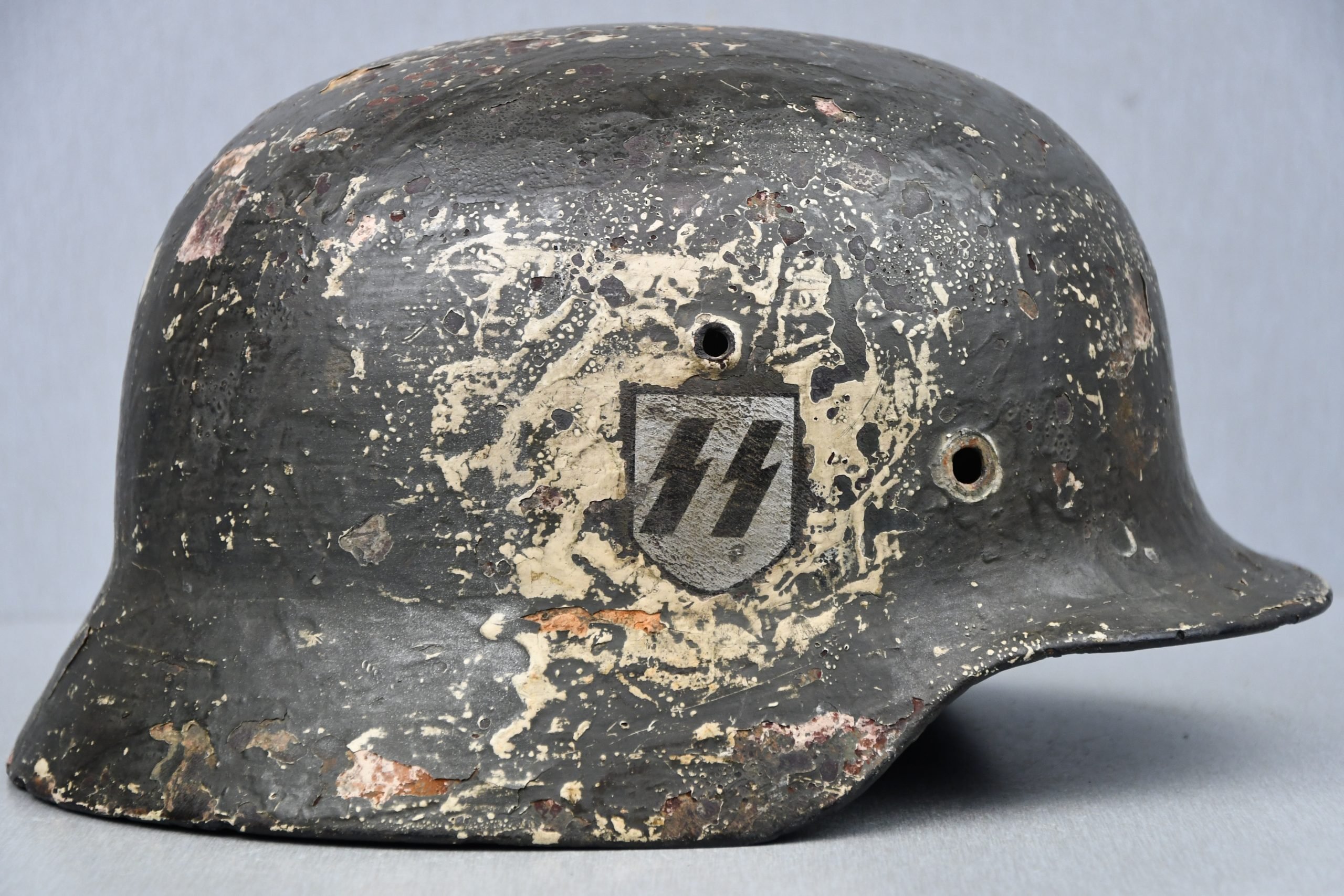 Original M35 helmet shell by 'SE'. This helmet would have been a double decal army example at the start.The helmet was post-war refurbished on the exterior(interior still retains its original green paint) with camo paint and SS decals. Marked SE66 – 3347.