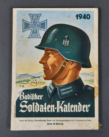 German WWII Badischer Soldatenkalender-The 'Badischer Soldatenkalender' (Baden Soldier's Calendar), which was also known as the 'Badischer Kriegerbund-Kalender' (Baden Warrior's Federation Calendar) in some years, was an illustrated historical calendar and annual publication primarily intended for German soldiers, particularly those from the Baden region. This is dated 1940 and contains 136 pages. It is in very good condition and except for some discoloration on the front cover it is very clean.