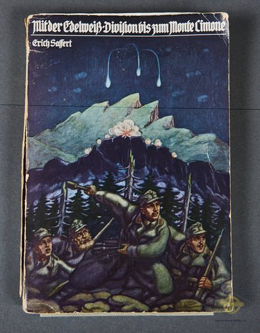 Mit Der Edelweiss Division Bis Zum Monte Cimone by Erich Saffert-This translates to 'With the Edelweiss Division to Monte Cimone'. The breakthrough battles of the Edelweiss Division in the South Tyrolean Alps in the spring and summer of 1916. From the diary of a war volunteer of the Salzburg House Regiment. This book is dated 1936. This contains 151 pages, in a softcover book. The spine in this book is broken, and a few pages are loose. The maps in the front are loose as well, so this book does have some damage. Priced according to condition.