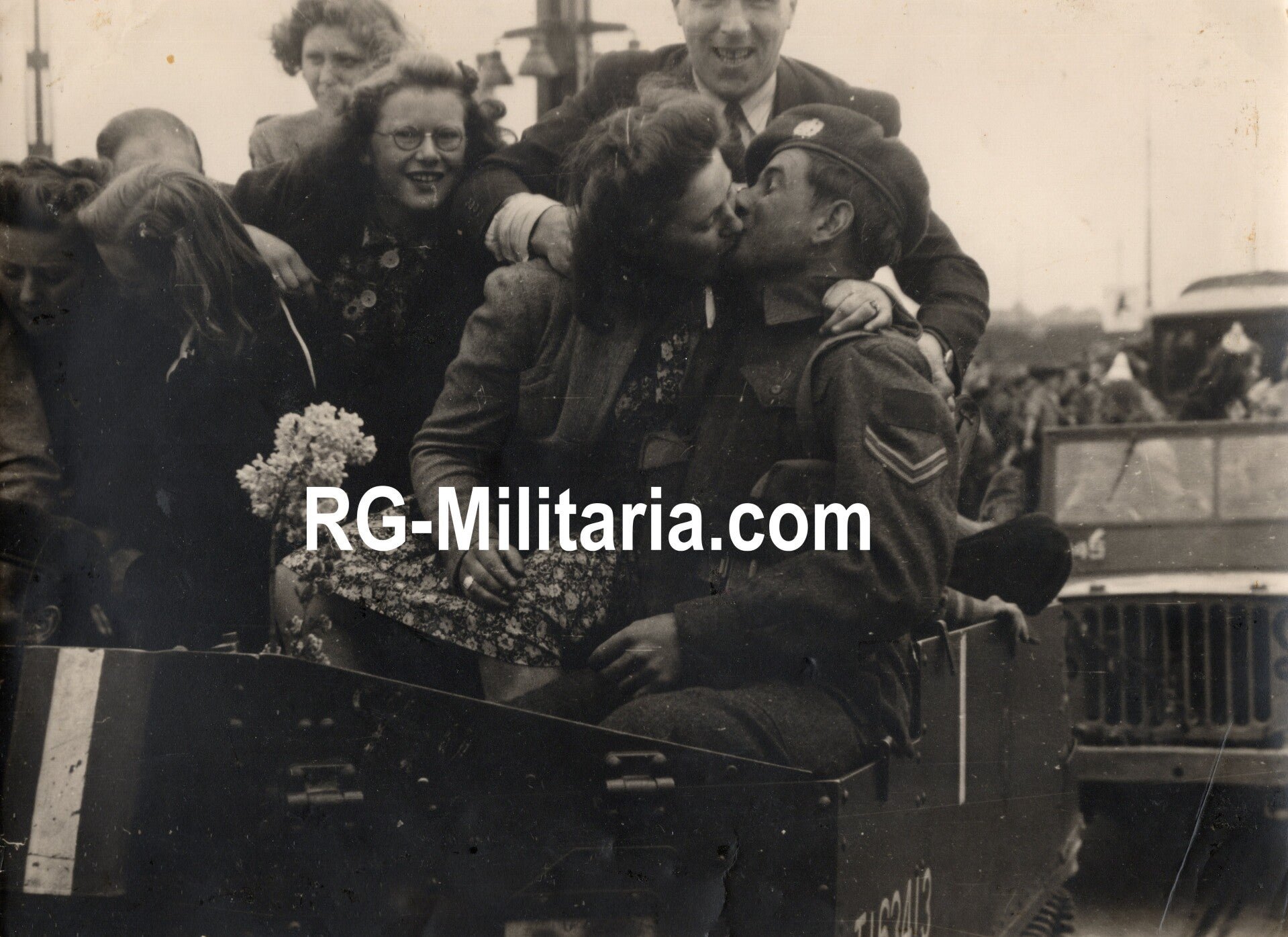 Original WW2 Dutch Liberation Press Photo - Canadian kisses a civilian in a Bren Gun Carrier during the liberation of Amsterdam, Holland (1945)Approximately 24 x 13 cmOriginele Wo2 Nederlandse Bevrijdings Persfoto - Canadees zoent een vrouw tijdens de bevrijding van Amsterdam, Nederland (1945)Ongeveer 24 x 13 cm