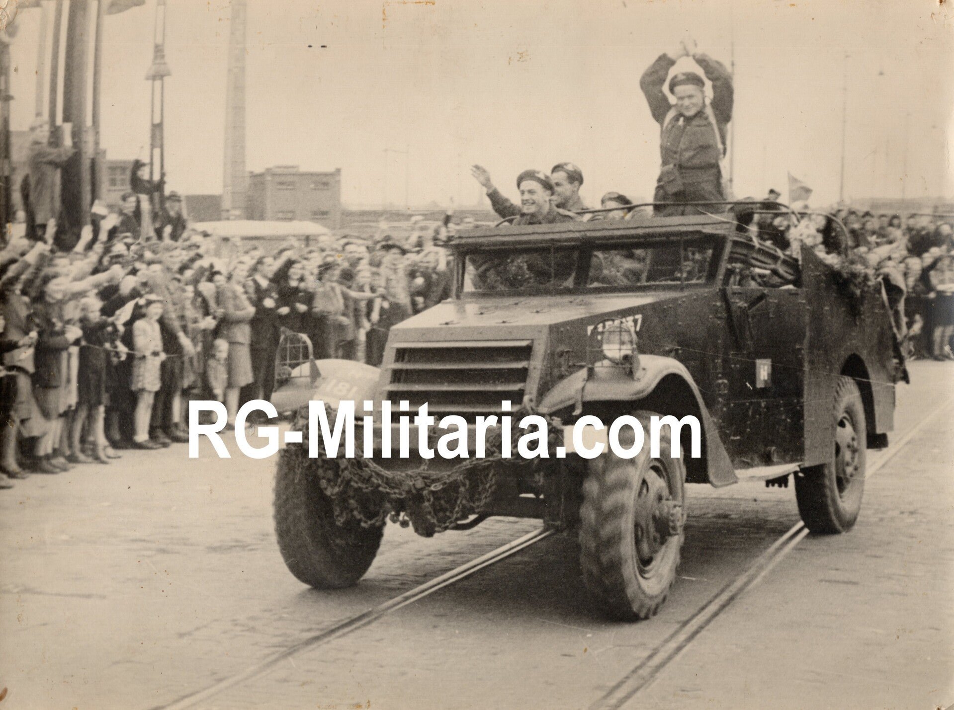 Original WW2 Dutch Liberation Press Photo - Canadians in an armoured vehicle liberate Amsterdam, Holland (1945)Approximately 24 x 13 cmOriginele Wo2 Nederlandse Bevrijdings Persfoto - Canadezen in een panzerwagen bevrijden Amsterdam, Nederland (1945)Ongeveer 24 x 13 cm