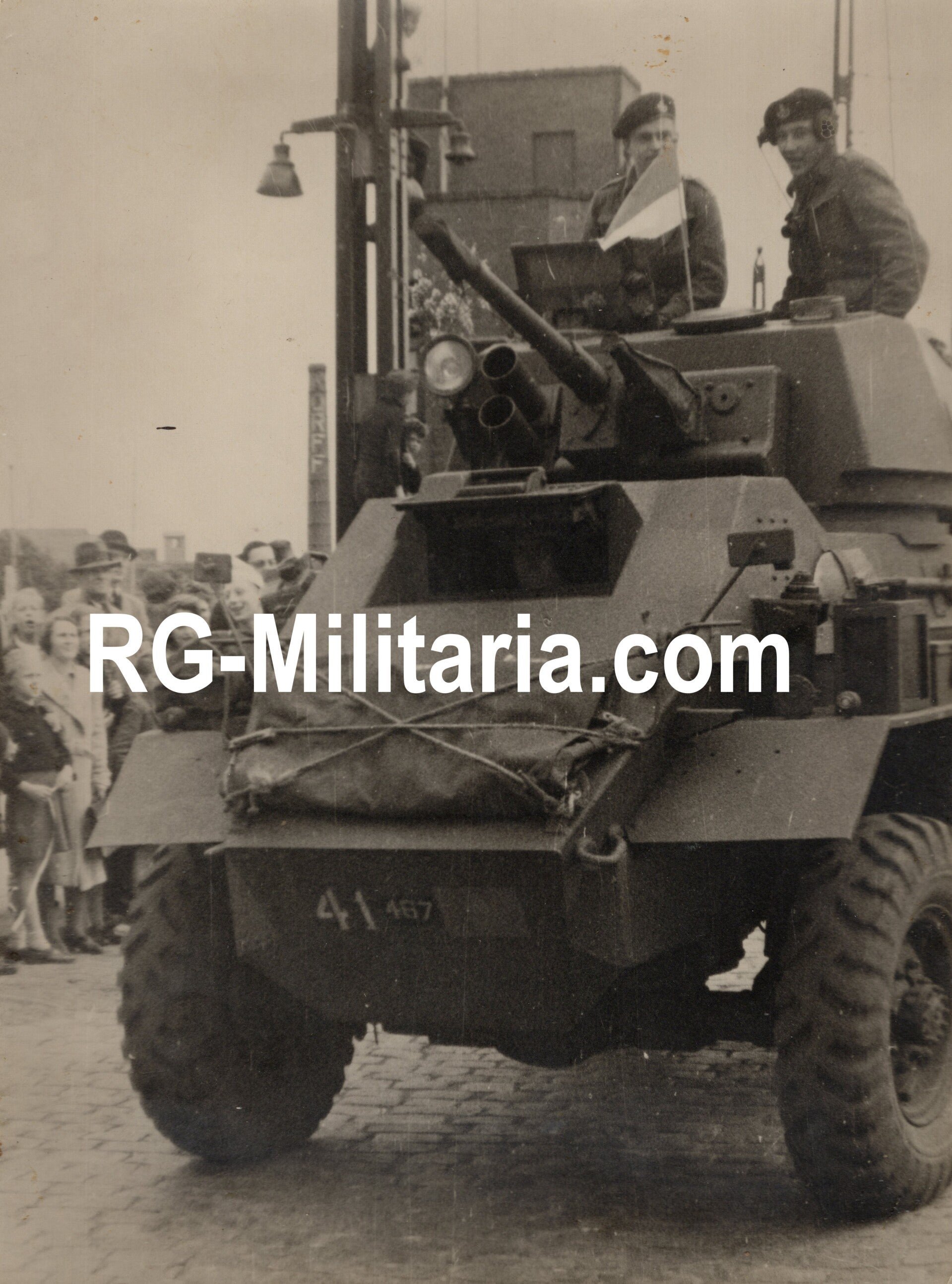 Original WW2 Dutch Liberation Press Photo - Canadians in an armoured vehicle liberate Amsterdam, Holland (1945)