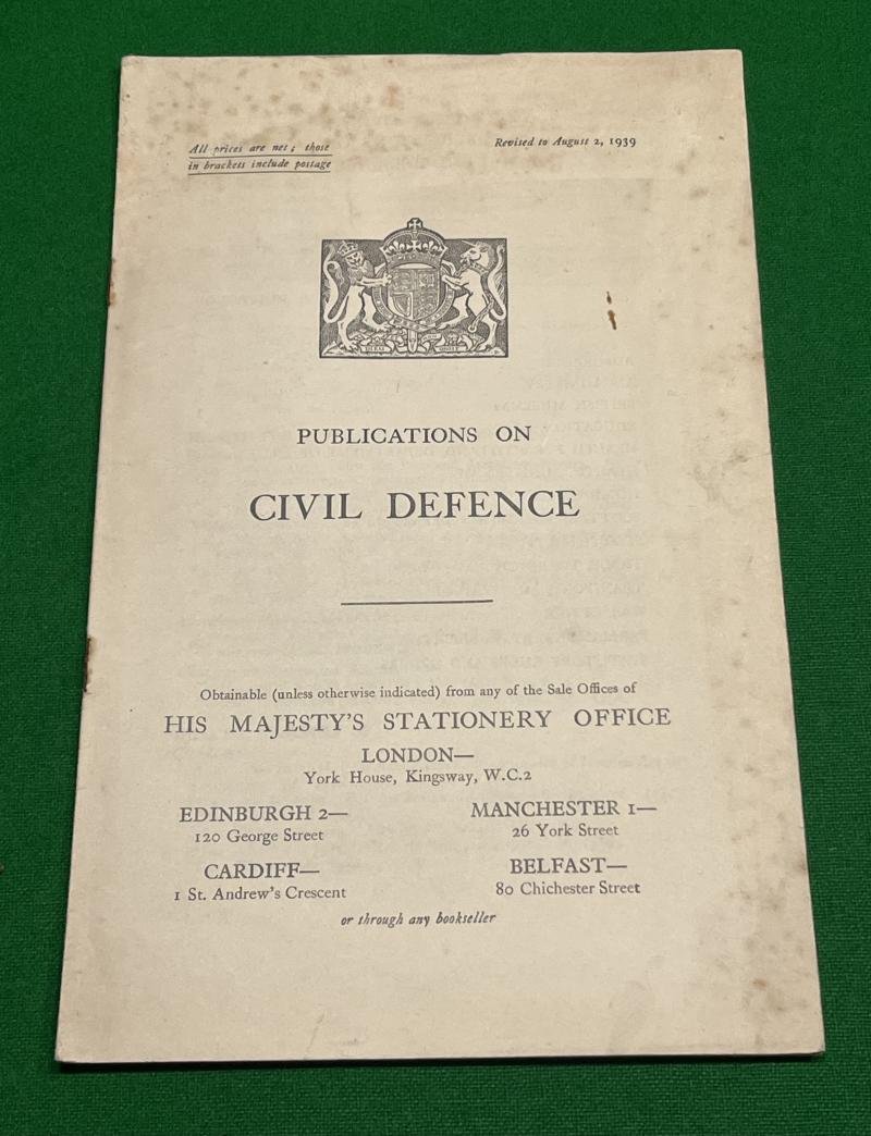 Published and revised to August 1939 by HMSO ' Publications on Civil Defence ' this 10pg pamphlet covers all Handbooks, Memoranda and Circulars. Also includes publications by the Scottish Office and various other Parliamentary departments. Good, slightly foxed condition. Useful and uncommon reference and is a good indication of the level of preparedness at the outbreak of war.