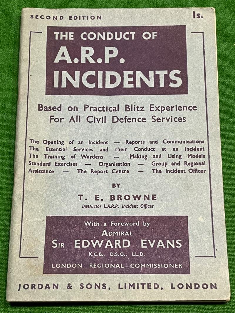 1942 ' The Conduct of A.R.P.Incidents ' by T.E.Browne, a guide for the Civil Defence Services. 48pgs outlining the management of an incident ' based on practical Blitz experiences '. Good, used condition with some minor rust staining to staples. Uncommon.