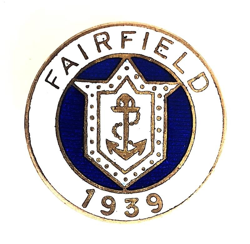A scarce original Second World War period 'Thornycroft 1939 home front brass lapel badge'; white enamel title circlet 'FAIRFIELD 1939', the centre depicting the companies white shield anchor logo on blue enamel ground; the reverse impressed with maker's details 'Thomas Fattorini Ltd Regent St. Birmingham' and impressed with official identification low issue number '381'. Very good condition, complete original buttonhole fitting, no damage to the enamel, minor service wear. Diameter approx 25mm.The Fairfield Shipbuilding and Engineering Company was a Scottish shipbuilding works in the Govan area on the Clyde in Glasgow and was a major warship builder for the Royal Navy.