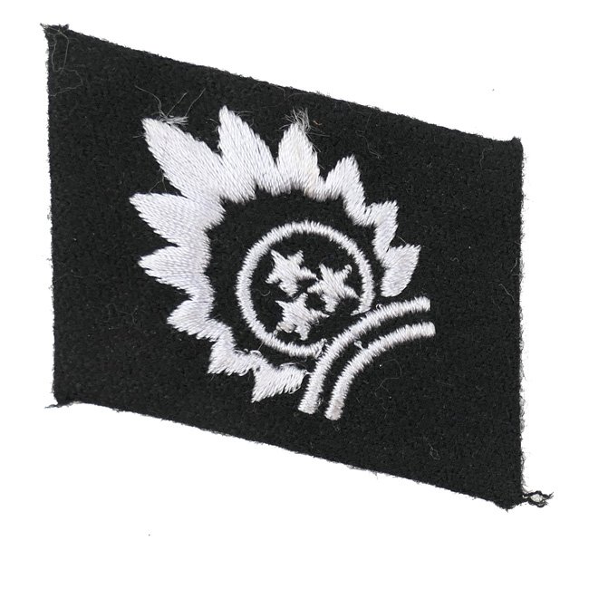 Waffen-SS Collar Tab (Kragenspiegel) as intended for a member within the '15. Waffen-Grenadier-Division der SS (Lettische Nr. 1). The '15. Waffen-Grenadier-Division der SS' was formed in february 1943. The sunburst design collar tab was introduced in the autumn of 1944. The collar tab is having a nice 'Buckram' backing. The collar-tab originates almost certainly from the SS clothing department at the Dachau KZ when liberated in 1945. The collar-tab is in good unissued condition with some minor traces caused by years of storage, nice original Latvian SS Volunteer's Collar-Tab!