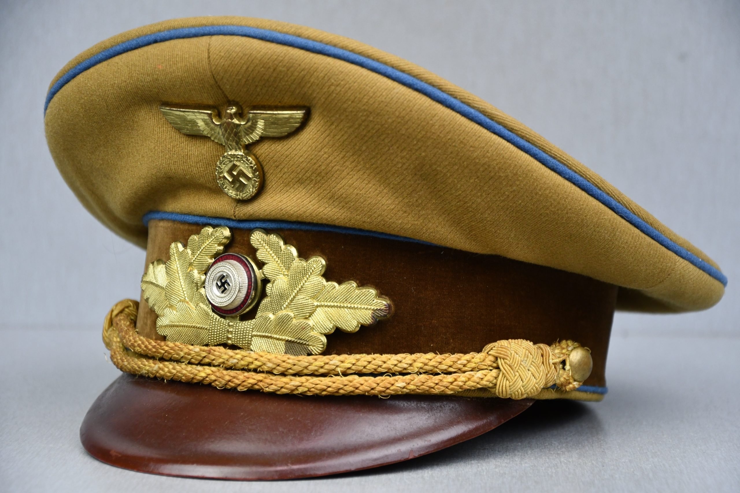 Genuine well preserved and light worn brown NSDAP leaders visor cap for a member of the Ortsgruppe (= blue piping). Complete with its genuine national insignia pierced through the front of the visor. RZM tag is still present under the sweat band. Leather sweat band possible replaced. Beautiful cap, in very good condition! size marked 56.