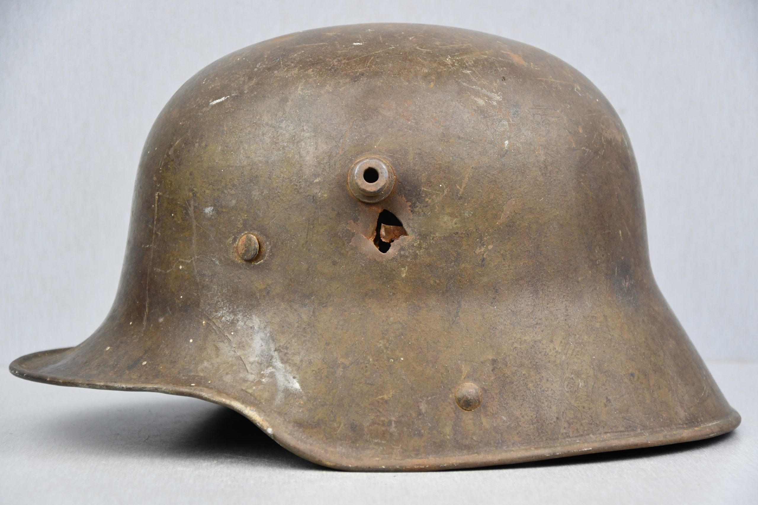 Original WW1 M16 steel helmet shell in good condition. Still retains its genuine mustard green paint both interior and exterior. Shows two period bullet holes, hence the reason why the leather liner is missing, because it was most likely stained with blood. The liner ring and split pins remain present. Shell marked E.T.64.