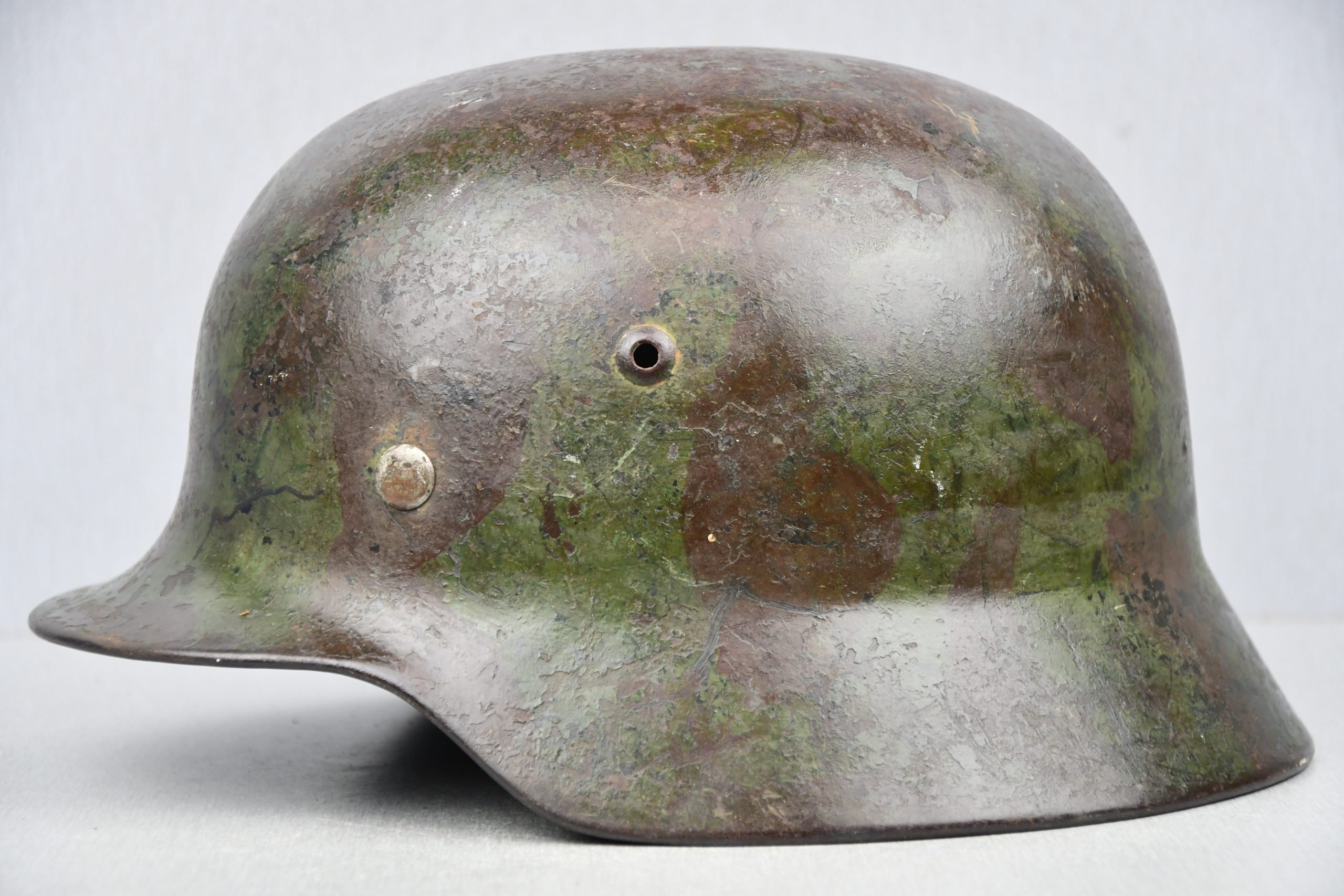 Genuine early Luftwaffe M35 helmet that first saw life as a glossy blue double decal example, most likely with droop-tail eagle decal. The helmet was nicely camouflaged in green with brown stripes and was worn afterwards. The helmet shows honest wear and patina. Complete with original early single aluminum band liner. Leather is soft and strog. Draw string replaced by a shoe string at the time. Shell markings ET64 β 4198.
