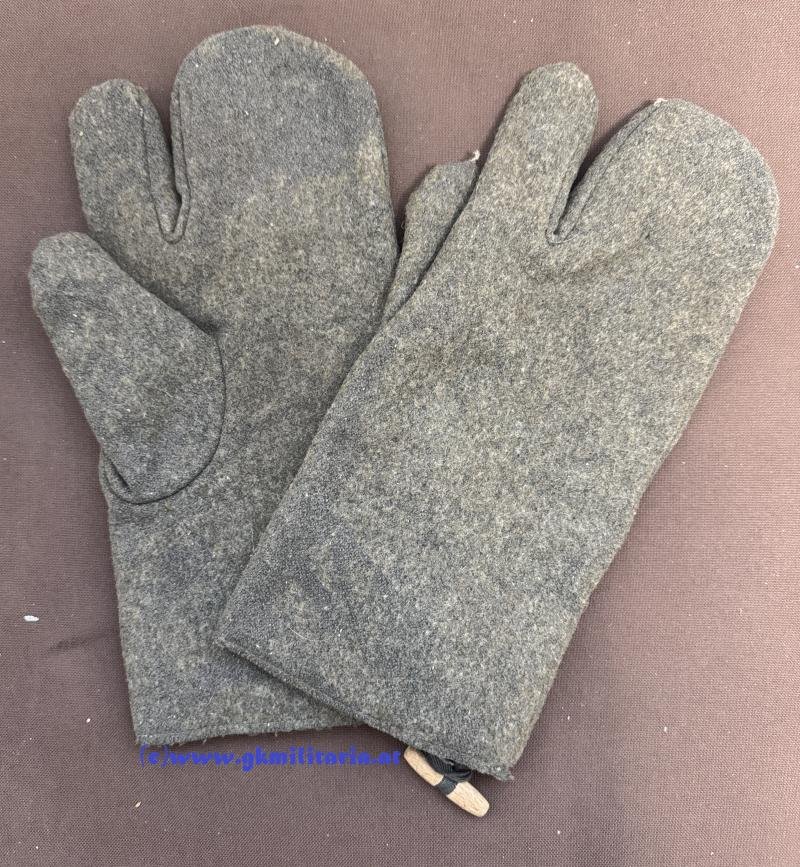 k.u.k. Kälteschutz-Fäustlinge mit Abzug-Zeigefinger! - aus grobem Wollstoff gefertigt - Schlaufe mit Olive aus Holz zum Zusammenbinden - leichte Lager- und Altersspuren - einige kleinere Löcher - guter gebrauchter Zustand! - selten!