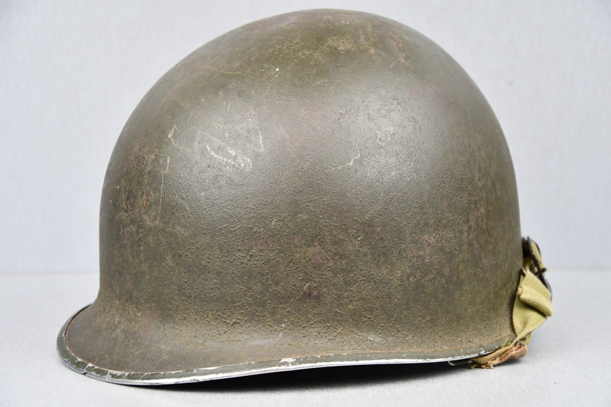 US WW2 M1 front seam fixed bale steel helmet with liner by Westinghouse