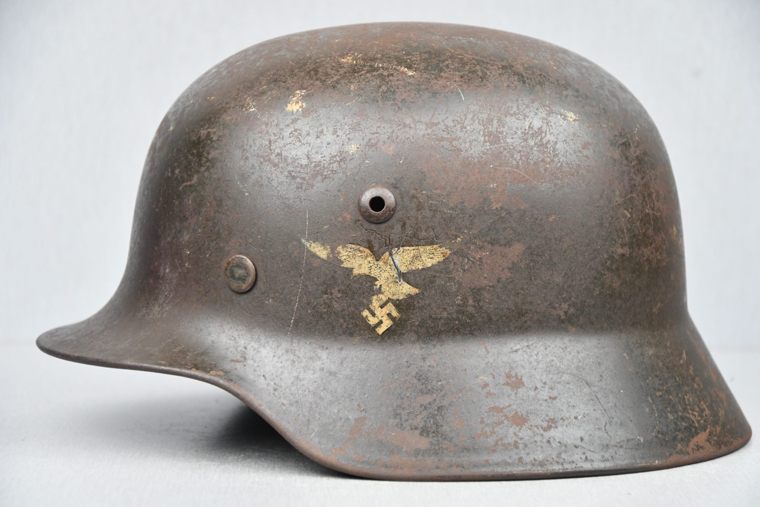 M35 blue colored Luftwaffe helmet with double decals. The Luftwaffe eagle is the desirable first pattern model often referred to as the 'Droop Tail' or 'Straight Leg' variant, typical for this manufacturer. Both decals are presentbut shows heavy wear. The helmet is complete with an early aluminum single band liner. The leather feels soft and shows light wear. It is unit marked on the reverse, typical for these early LW lids but almost impossible to read. A name tag is also sewn on the reverse of the liner, again a typical feature for early helmets. Untouched helmet, split pins remain firm and tight. Maker marked by Q (Quist) size 62 (Q62), lotnumber 408.