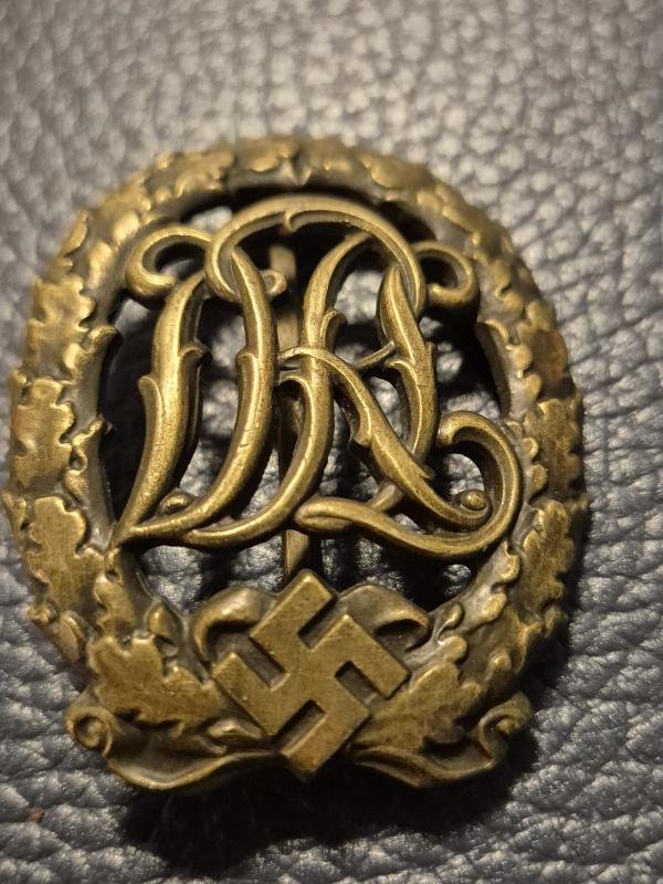 Genuine DRL Sport Badge in German- Deutscher Reichsbund für Leibesübungen- looks very good with old patina on the back maker details. Very good looking badgeGood for display