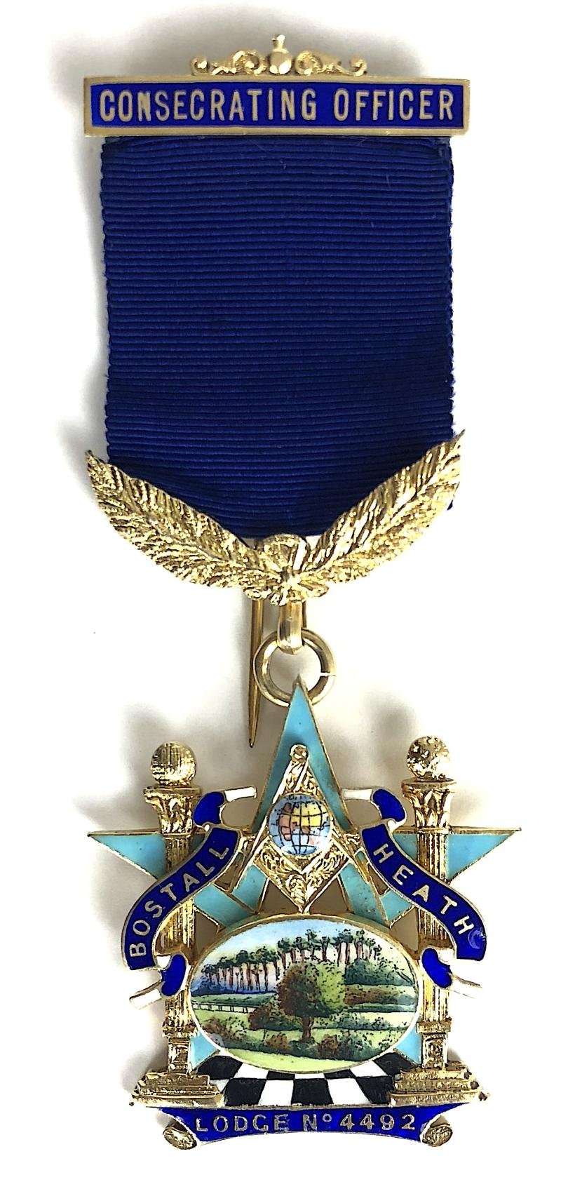A scarce original circa 1922 period 'Masonic Consecrating Officer Bostall Heath Lodge No 4492 stunning silver gilt and enamel medal', the reverse impressed with London silver hallmarks for 1922 and maker's details 'Toye & Co London'. Very good condition, complete with original single pin fittings, no stress marks or enamel loss.Height approx 103mm.