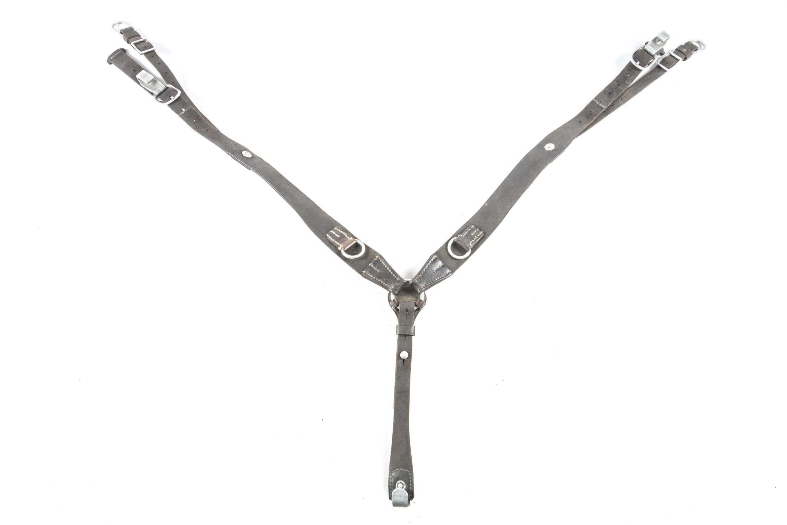 Rare pre war Y-strap marked Frost & Jahnel Breslau 1939. The strap is a pre war example which was produced in the time it still was a experimental piece. Only a small portion of the airlanding infantry used them in 1940 during the Fall Gelb campaign. The straps feature all aluminium hardware. The D-ring attatchment straps have been repaired at some point but are original to the straps. This is a very rare strap in good used condition!