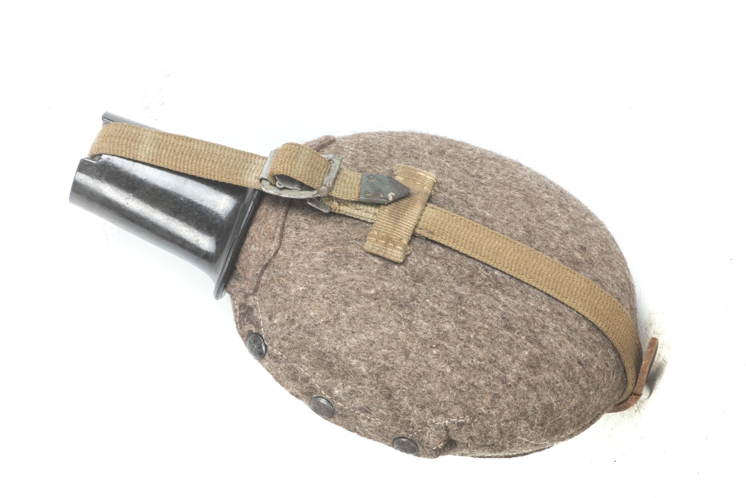 Textbook 1L Tropical Labeflasche in very good condition. The canteen is nicely marked VAL 43 which indicates production by a rare and still unidentified manufacturer. The inside of the screwing cap features cork instead of rubber which is a typical feature for this manufacturer! Sadly the leather strap on the bottom features a tear. Very nice Tropical 1L Labeflasche by a rare manufacturer!