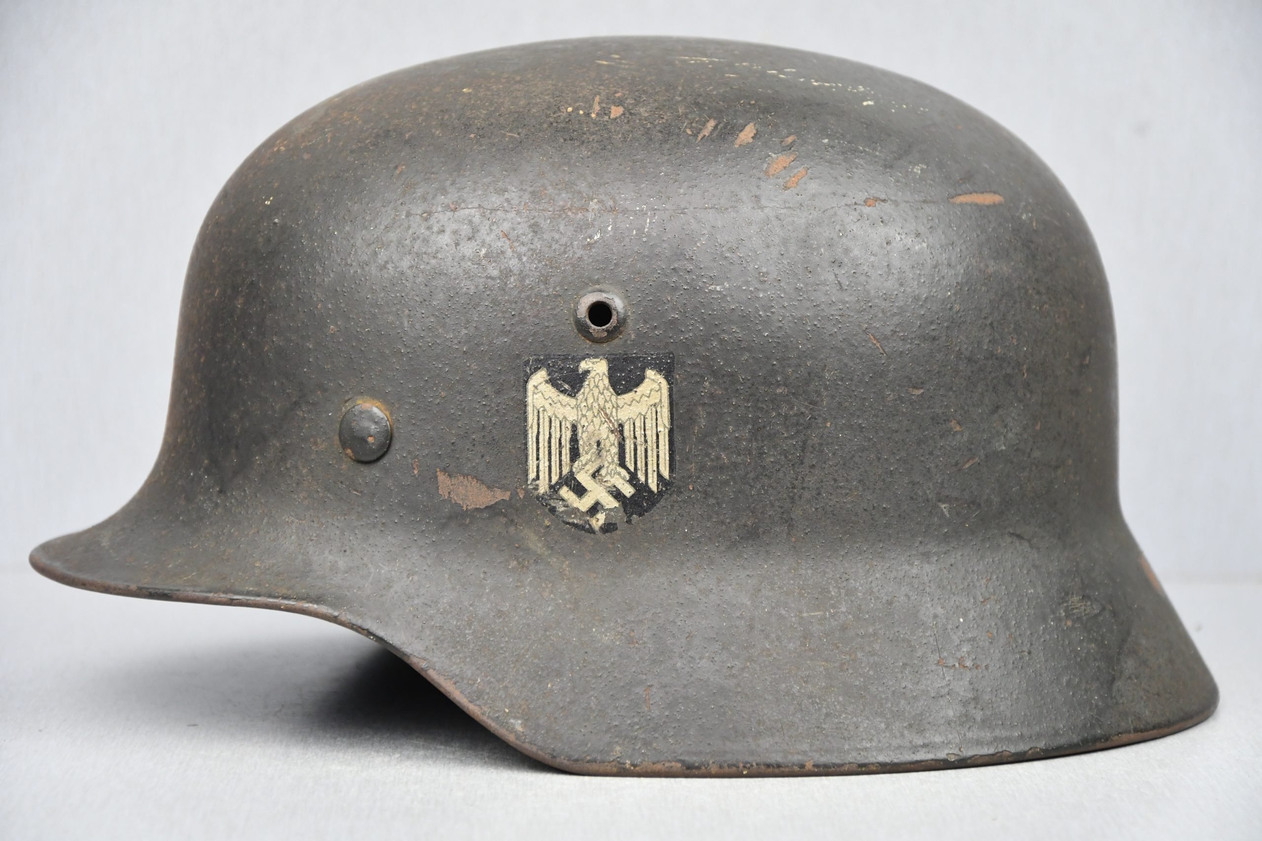 Beautiful textbook M35 steel helmet, reissued example ca. 1941. This helmet, was factory reissued during the war, receiving a new thick rough field green layer of paint and a new decal. The decal is a textbook example that I like to see on reissued helmets, being produced by Methner and Burger (Grey lined eagle). It shows sharp details and is nearly 100% intact. The helmet is complete with its 1940 dated liner and you can clearly see the split pins are untouched and straight. The leather itself is supple and remains in very good condition . Shell markings are bearly visible due to the thick sand mixed paint, I belive to be Q66 – 5641. Named to S. Kaufmann. A beautiful UNTOUCHED M35 army steel helmet!