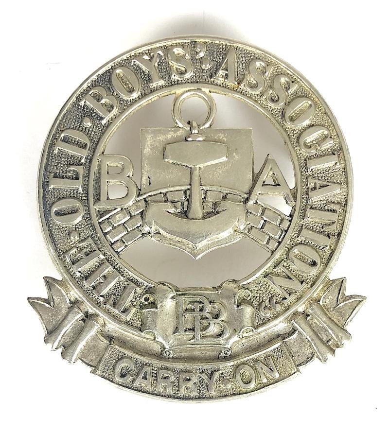 A rare original short-lived circa 1931-1936 'The Old Boys' Association beret badge'; large die-stamped white metal title circlet with entwined 'BB' escutcheon and bearing 'Carry On' slogan scroll below; the voided centre depicting a shield with stylised 'Stone Bridge' and plain anchor to the fore, flanked by initial 'OBA'. Very good condition, complete with original toned loop fittings to reverse, both bent.Height approx 48mm.