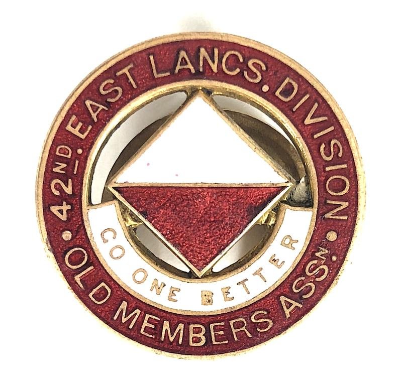 A very scarce original inter war period '42nd East Lancashire Division gilt brass enamel lapel badge' in the form of a red enamel title circlet, the voided centre depicting a diamond division sign inlaid with half white, half red enamel and beaing white enamel motto scroll 'Go One Better' (bestowed on the division by its commander Major-General Arthur Solly-Flood on 1 March 1918), the reverse impressed with maker's details 'J.R.Gaunt & Son London'. Very good condition, no enamel loss, minor surface scratches.Diameter approx 25mm.