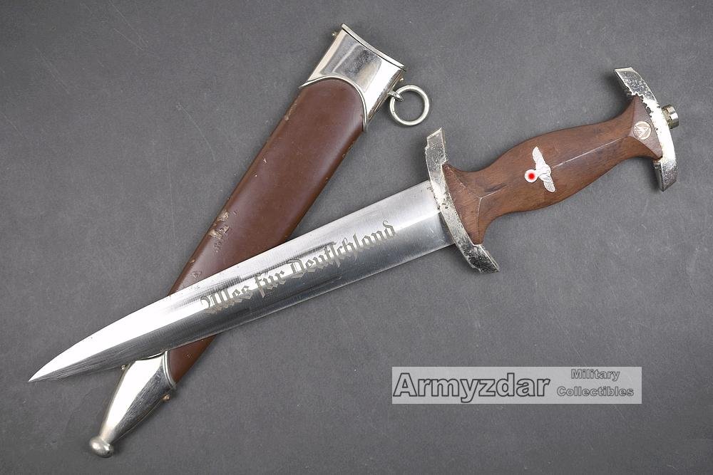 This is a very nice SA dagger with brown scabbard. The scabbard has original chocolate brown color. On the blade is maker marked RZM M7/80 and of courser Alle für Deutschland. The wooden grip is nice and untouched pin and eagle. The blade is in perfect condition.