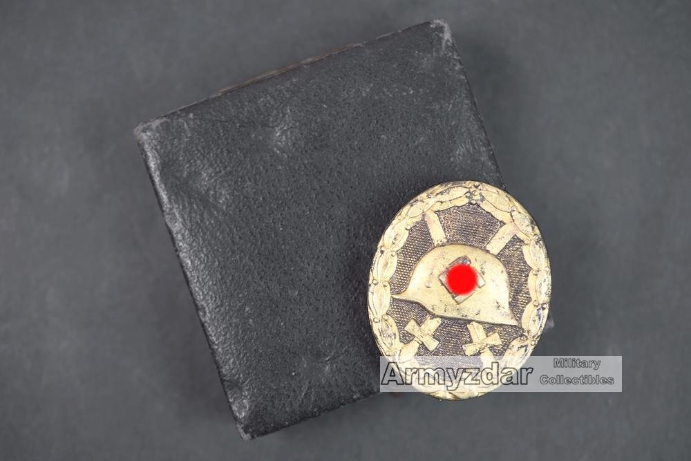 This is a good used German gold wound badge with its box. The bdage still has about 90% of original gold finish. On reverse is maker marked 30.Maker: Hauptmünzamt WienMaterial: zinc