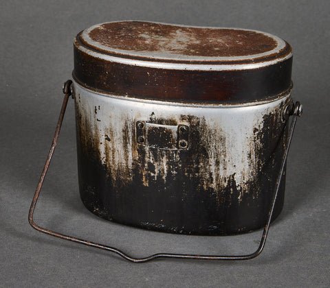 Japanese WWII Mess Kit-This Japanese WWII mess kit, is known as the Ro as it does not have the inner tray. This is a kidney-shaped aluminum pot with a lid. This served as both a rice cooker and eating dish. They would often be used over open fires and you can see that this one still shows the scorch marks from cooking. It has the wire carrying handle, and a buckle on the front. This is in overall very good condition. This is nicely marked on the reverse of the bottom piece.