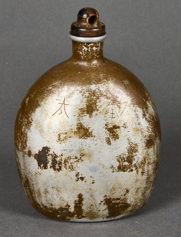 Japanese WWII Canteen-This canteen is made of aluminum with an olive brown finish which is mostly missing. It has no straps remaining. The stopper is present on this example. It is just the canteen body. This is marked on the bottom of the canteen. There is also what appears to be a name in kanji scratched into the front. Overall, good condition.