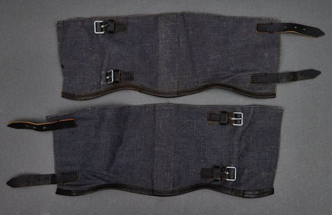 German WWII Luftwaffe Gaiters-This is a scarce set of gaiters. These are produced in blue grey canvas. The black leather straps and trim is very good. There is some fading to the canvas. Each of these are RBN'rd. In very good condition. These are scarce.