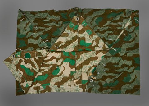 German WWII Zeltbahn-This shelter quarter is in very good condition. The splinter camo is beautiful and hardly faded at all. This zeltbahn has all the correct characteristics of a period shelter quarter. All buttons appear to be in place. There is one field repair that shows some fraying, this would have been done in the field during wartime. There are a few holes, but this does not distract from this zeltbahn. Overall, this is very good condition.