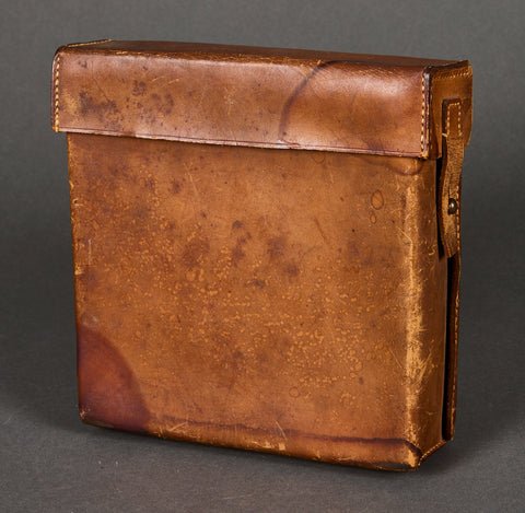 Veteran Bring Back German WWII Medical Leather Pouch-This case would be used for holding ointments and dressings to treat soldiers suffering the effects of being gassed. This case is very well marked, with a nice contents list posted inside. Written in German of course. The case is made of a heavy duty camel brown leather that shows spots of discoloration from use and storage. The straps on the lid with studs are in place and are still nice and pliable. There are two straps on the reverse for attaching to a belt or a pack. This pack was brought home by a US veteran, we will supply the name of this soldier to the buyer. Overall, this is very good condition.