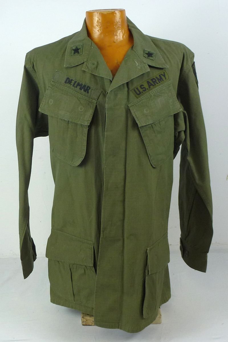 The jungle jacket of Brigadier General (and later Major General) Del Mar shows wear and use, but it is without holes, damage or repairs. The left shoulder carries the subdued insignia of the U.S. Army in Vietnam. General Del Mar served in the Pacific Theater in World War II as an infantry officer in the 77th Infantry Division. He subsequently served as the Commanding General of the U.S. Army Support Command for the Pacific-Vietnam, at Cam Rahn Bay. His decorations included the Combat Infantry Badge; the Distinguished Service Medal; the Legion of Merit; the Bronze Star Medal with 'V' device and three oak leaf clusters; and the Purple Heart with two oak leaf clusters. Overall the jungle jacket is in very good condition.