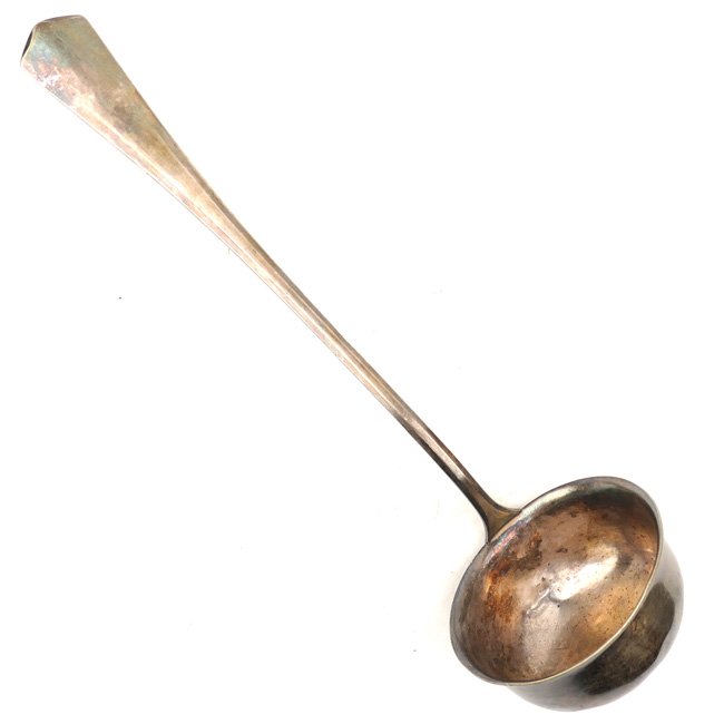 Large sized silvered Kriegsmarine Soup Ladle (Suppenlöffel). The large sized Kriegsmarine Mess Hall Soup Ladle is nicely marked with a Kriegsmarine acceptance marking showing an eagle above a capital 'M'. Rare original soup ladle in good condition!