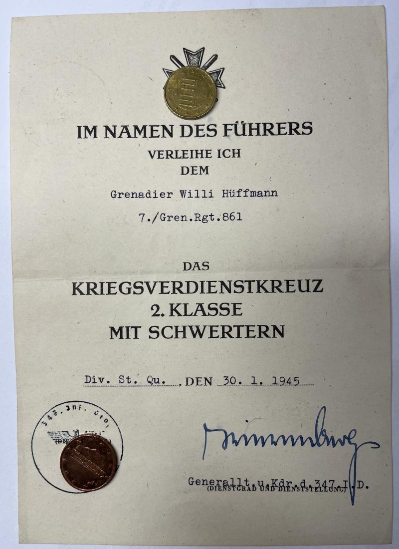 KvK II m.Schw. citation of 'Grenadier' Willi Hüffmann who served within Gren.Rgt.861 of the 347.Inf.Div.By the time this citation was signed by 'Generalleutnant' Wolf Trierenberg (DKiG 5-5-1942,RK. 10-5-1943) ,the 347.Inf.Div. was fighting in the Saarpfalz area.