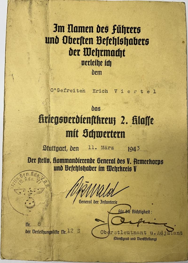 Nice variant KvK II m.Schw. citation of 'Obergefreiten' Erich Viertel who served under command of the Wehrkreis V.The citation bears the printed signature of 'General der Infanterie' Erwin Osswald (DKiS 1-9-1943) and has been handsigned by 'Oberstleutnant' and 'Adjutant' ?.