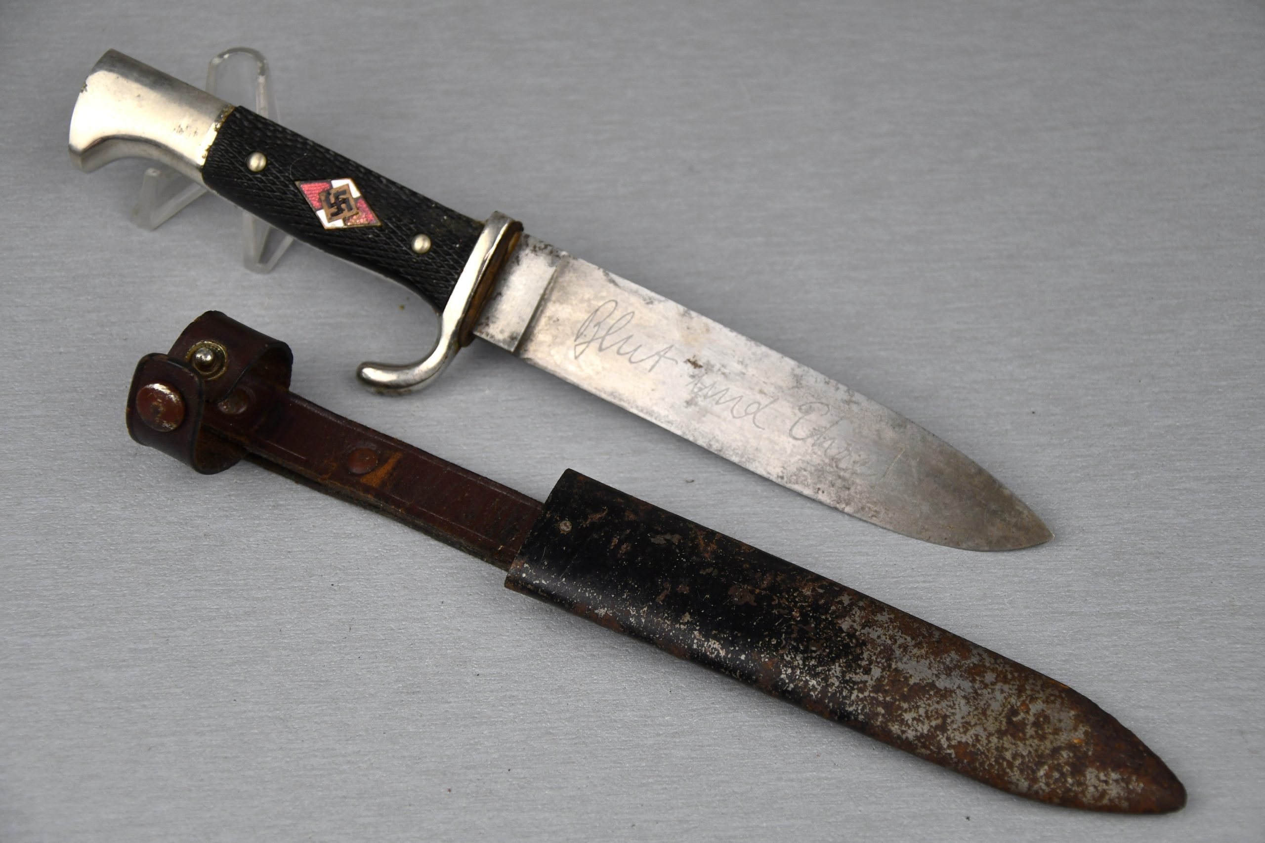 Light worn Hitler-Jugend dagger in good condition. Blade shows normal wear. Motto 'Blut und Ehre' still firmly present. Complete with scabbard, still has the LFS maker mark on the leather. Marker marked blade on the reverse by RZM 7/14, dated 1936 (P.D. Luneschloss, Solingen). HJ diamond shows some enamel damage from wear.SHIPPING ONLY IN MAINLAND EUROPE!