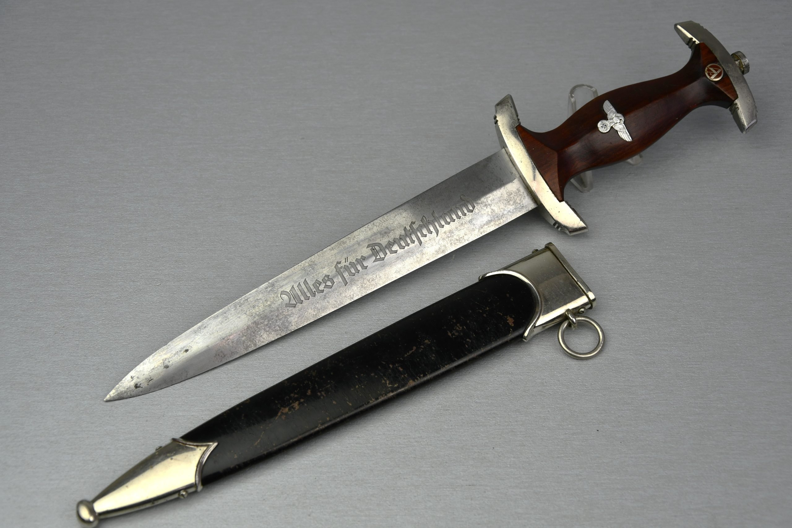 Stunning and rare transitional NSKK / SA dagger in good condition. These daggers were produced in the small period between the maker marks and the RZM marks and carried both logo's on the blade. This example was made by Carl Eickhorn in 1938 (RZM M7/66) from Solingen. The dagger and scabbard remain in very good condition showing nice details. The blade remains in overall very good condition! Black scabbard with original finsih present, shows nice patina and wear. A rarely seendagger offered for sale here!SHIPPING IN MAINLAND EUROPE ONLY!