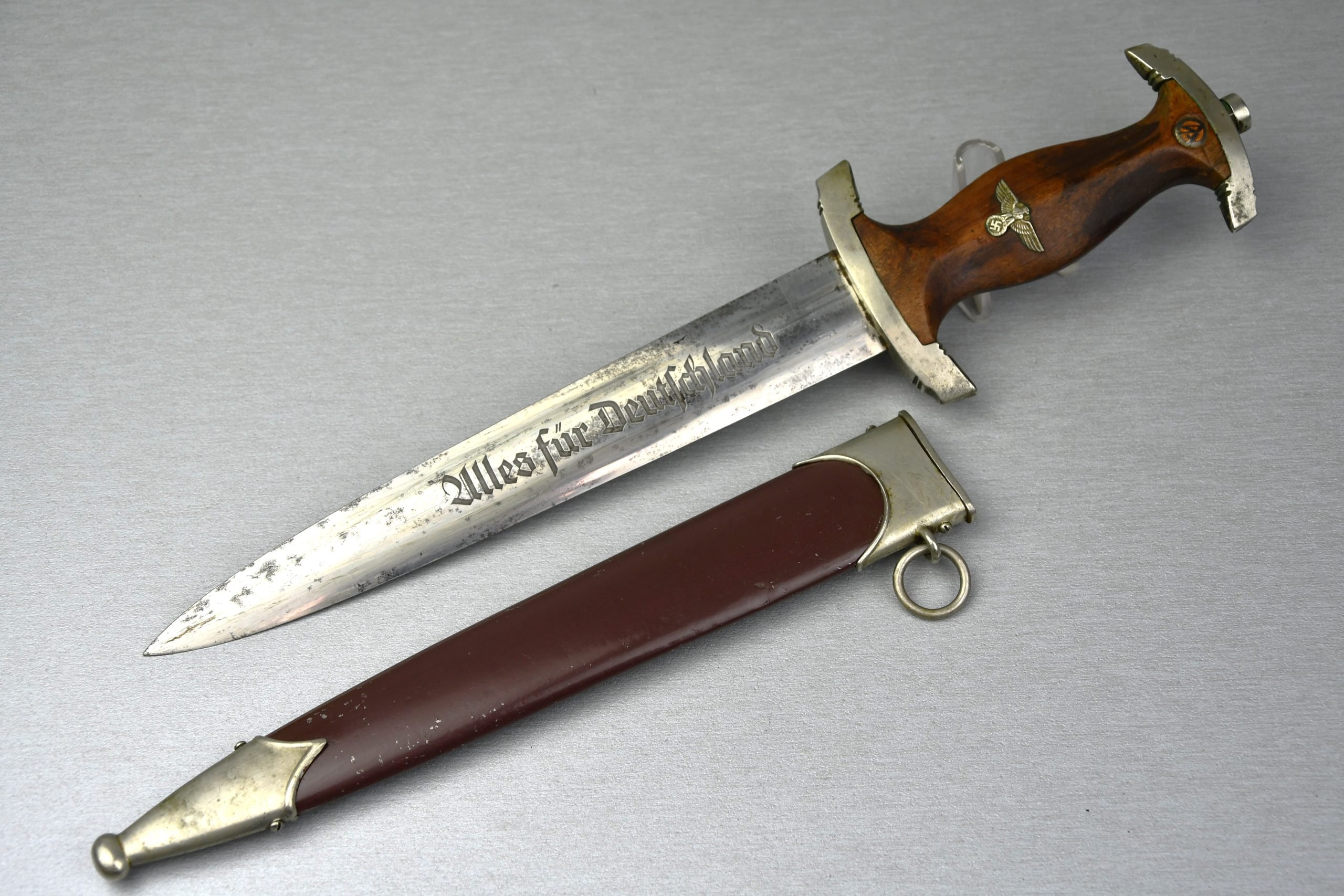 Early SA dagger in good condition. Maker marked by E.P & S. Solingen (Ernst Pack & Sohne). Ground Röhm example, but still some pieces of the original text visible on the reverse. Cross guard is marked with Wf. Scabbard matches the dagger and has been refinished, most likely during the period, as often observed with these early pieces. Beautiful detailed grip eagle, executed in nickel silver.SHIPPING ONLY IN MAINLAND EUROPE!