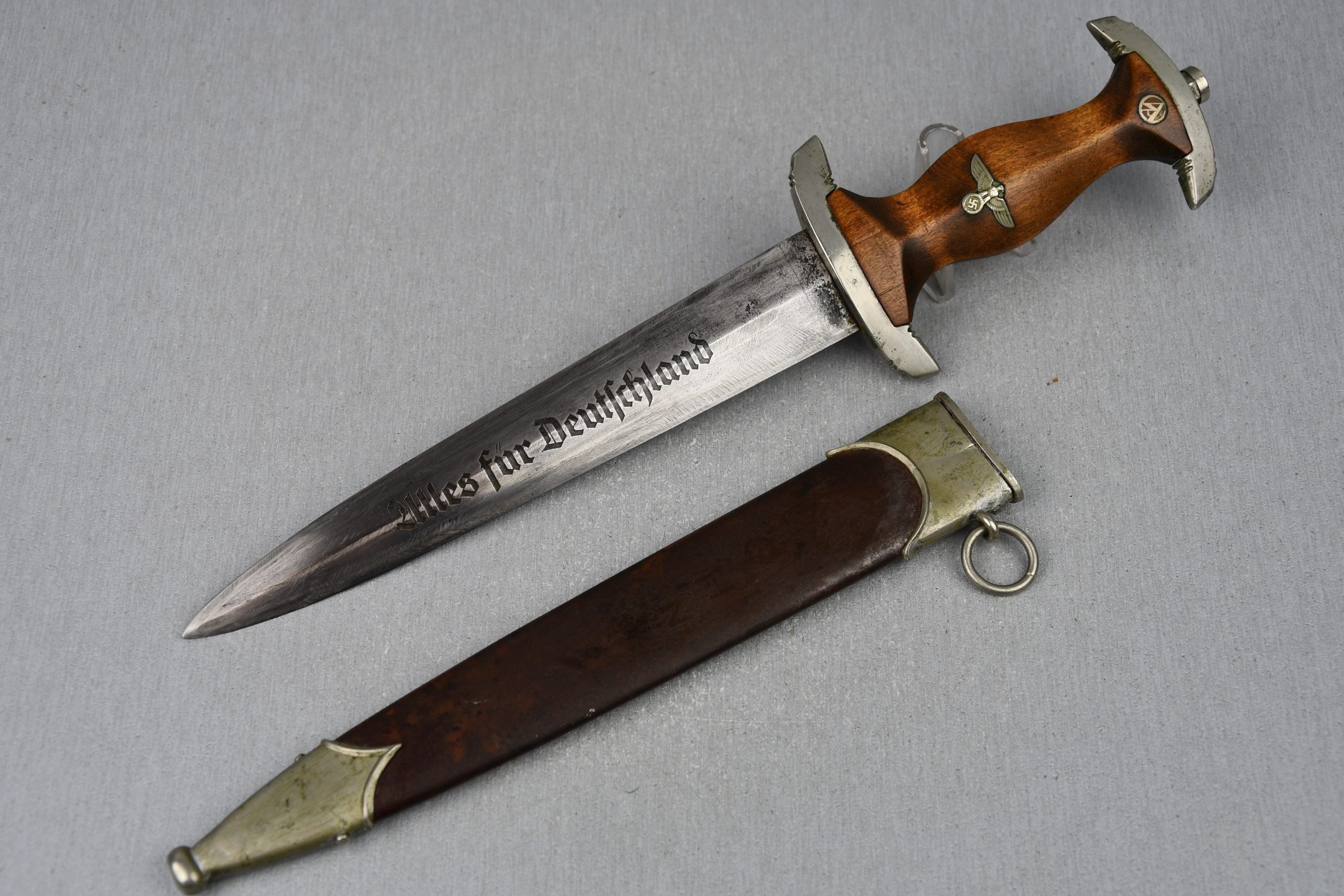 Offered here is an original early SA Dienstdolch M33 with full Ernst Röhm dedication, manufactured by Carl Eickhorn, Solingen. A highly collectible and historically interesting example, positively discussed and evaluated by advanced collectors. The dagger features the low-positioned Eickhorn squirrel trademark, correct for early Full Röhm production. The blade retains its original Röhm dedication on the reverse and'Alles für Deutschland'on the obverse. The dedication is original, intact, and not erased. The lower crossguard is clearly stamped with the 'Ho' SA Gruppe district marking, which is well-struck and correct for the period. The blade shows evidence of period re-tipping and re-tapering, most likely due to the common practice of breaking the blade tip during the Röhm purge (1934), followed by a later-period repair. This is widely observed on Röhm daggers and is considered a period modification rather than a post-war alteration. Surface patina and age-related wear are fully consistent with originality. The solid nickel-silver fittings display honest wear. The wooden grip is well-preserved, with a nicely seated SA roundel and eagle. The scabbard retains its original brown anodized finish and shows clear signs of use, which add to the overall character and authenticity of the piece. The wear is even and honest, presenting in a positive, untouched manner, with correct fittings and matching patina throughout. A genuine and historically meaningful Röhm SA dagger, offering strong collector appeal and an excellent example of a period-correct, well-used piece for an advanced collection.SHIPPING ONLY IN MAINLAND EUROPE!