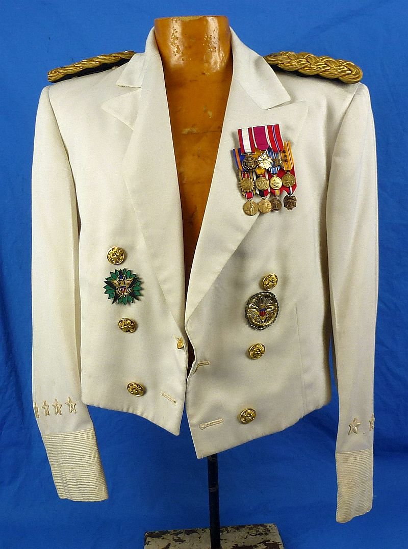 The mess jacket is tailored in a high quality tropical weight white wool. The jacket bears four cloth rank stars on each cuff, while the jacket displays a bullion embroidered Secretary of Defense identification badge as well as a bullion embroidered Army General Staff identification badge, both with clutch back fasteners. General Collins's miniature medals are mounted on the lapels. The jacket exhibits mild age toning and some subtle spots, but overall the jacket is in excellent condition.James Francis Collins was born in The Bronx on 2 September 1905, and raised in the Van Nest neighborhood. A graduate of the United States Military Academy at West Point, he gained his commission in 1927 into the Field Artillery.He later attended the National War College. He also worked in the Hawaiian Division before the outbreak of World War II, during which he served exclusively in the Pacific Theater.At the close of World War II, Collins commanded the I Corps Artillery in the Philippines and in Japan. From 1954 to 1957 he commanded the U.S. Army, Alaska. Afterward he commanded the 71st and 2nd Infantry Divisions before his tour in Hawaii. Other significant assignments include serving on the faculty of the Army War College and as Deputy Chief of Staff for Personnel, Department of the Army in Washington, D.C.Collins was appointed President of the American Red Cross in 1964, one month after retiring from the Army. During his tenure he enhanced Red Cross services to American military personnel in Vietnam and to military hospitals worldwide.He died at Walter Reed Army Medical Center on 22 January 1989. He is buried with his wife Marian A. (1905–1986) at Arlington National Cemetery.