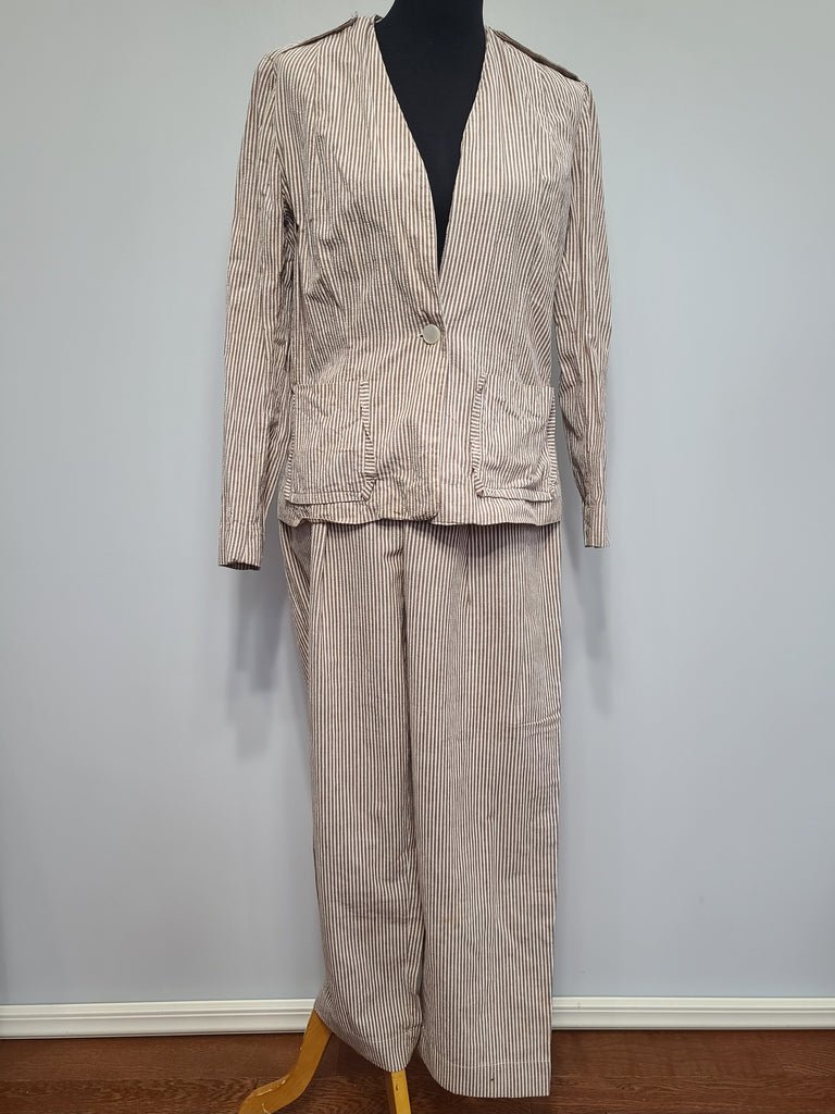 Original WWII ANC (Army Nurse Corps) seersucker jacket and trousers set.MEASUREMENTS (approximate):JACKET:Bust- 42'Waist- 36'Length- 24 1/2'Sleeve(shoulder seam to end of cuff) - 23 1/2'TROUSERS:Waist- 32'Hips- 42'Inseam- 27 1/2'Length- 42'Jacket is labeled size 18 (tag is very washed out). Trousers are labeled size 38. Overall fairly good condition. One tiny hole on one sleeve. The trousers have been sewn in and let back out (still some slightly odd stitching). Side metal zipper.Some light staining and scattered brown specks (the stripes do hide it quite well).There are some pulls in the material There is a name and serial number written inside the pants 'Bailie N754359'. Nothing written in the jacket.