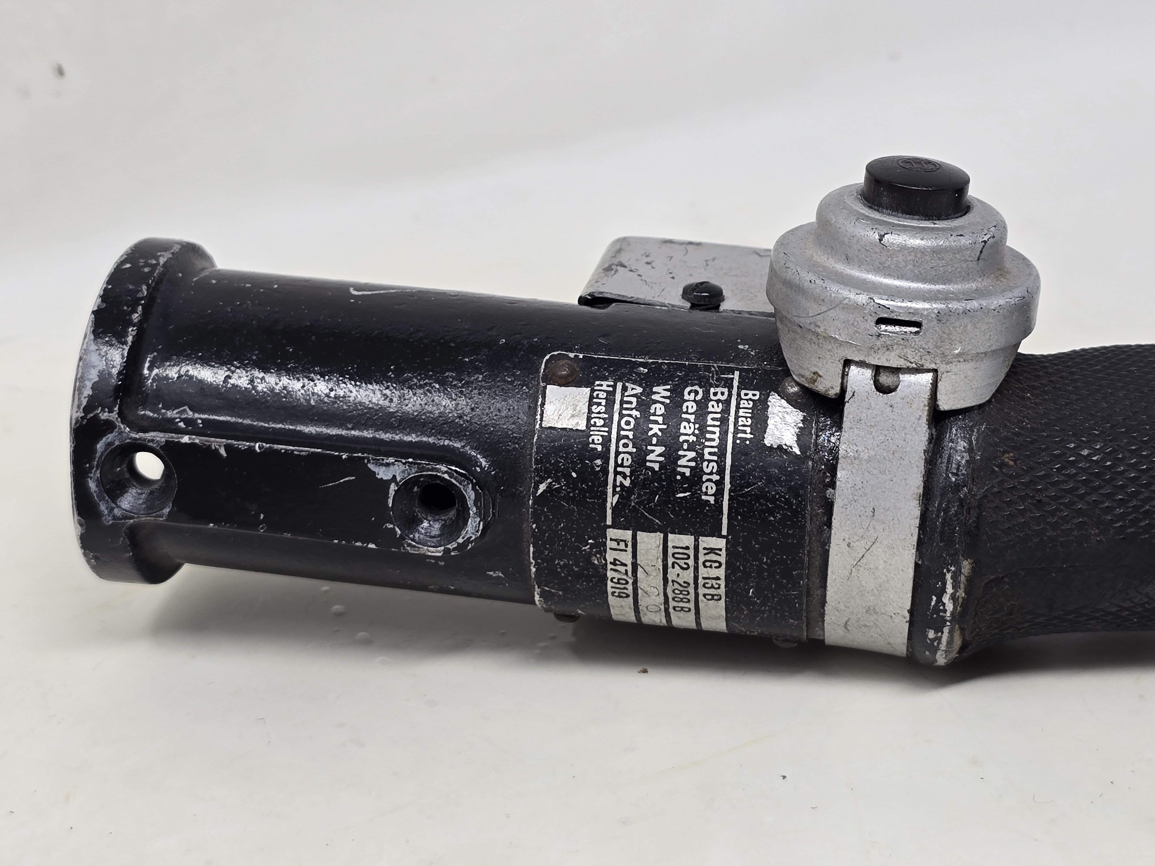 This is a joystick from a German World War 2 combat aircraft. The nomenclature plate is clear and shows the manufacturer data. Among the features are the Flip-top gun switch on top of the joystick. Interesting addition to the aviation collection.. COA accompanies.