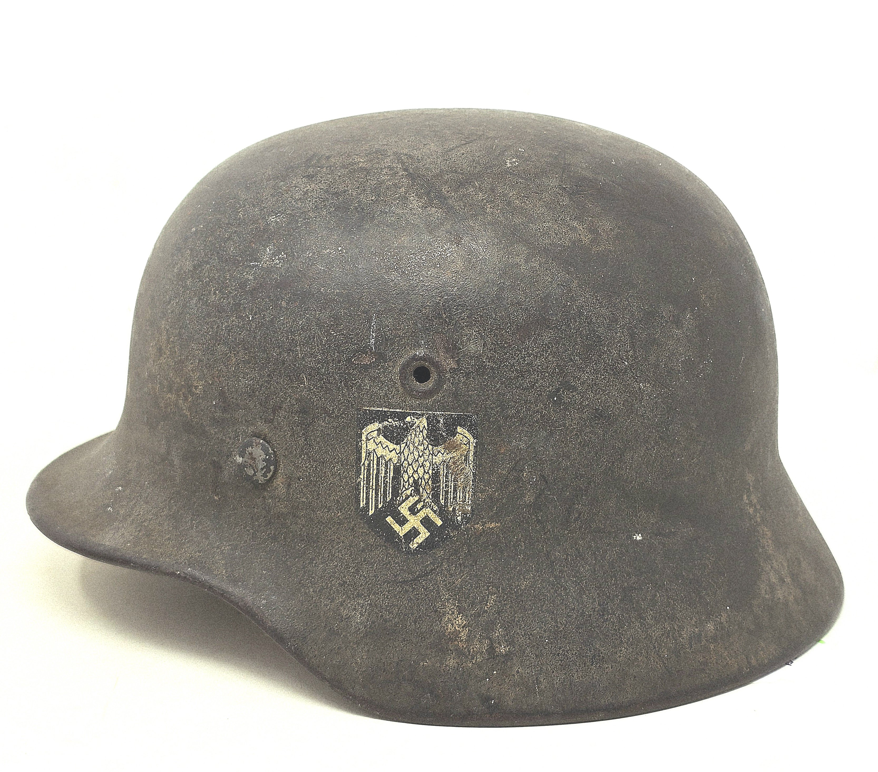 Here is an actual DAK helmet consisting of a army M42, EF62 shell, # 8136, that was picked up in Tunisia, in May of 1943 by a US army lieutenant colonel. The helmet shows a light dusting of tan camo with a full army shield and overall in excellent condition. Unfortunately, the liner was treated at some point many years ago; evidence remains of the treatment. Overall, a great Afrika Korps helmet for the top shelf DAK collection. COA accompanies.