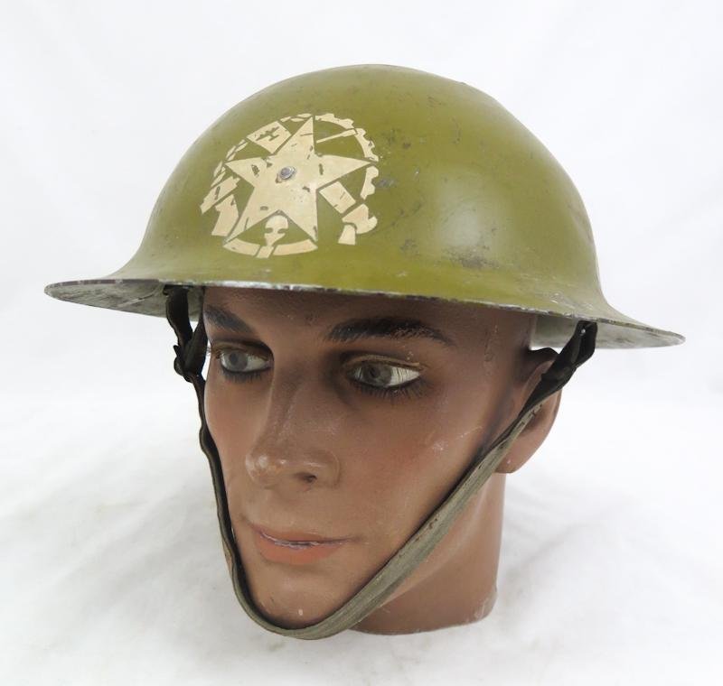 ENG WW2 Soviet M38 civil defense helmet. Modelled after WW1 British Mk1 helmet. Used by civil defense and occassionally by armed forces too. Mustard green paint. On front a white painted Osoviakhim logo. Grey cloth liner. Grey cloth chin strap with some rust spots on it. Nice and rare original soviet helmet!FIN 2MS Neuvostoliittolainen M38 väestönsuojelu kypärä. Kopio brittiläisestä 1MS Mk1 kypärästä. Sinapin vihreä maalipinta. Harmaa kangas sisusta. Harmaa kangas leukahihna, jossa ruoste tahroja. Edessä 'Osoviakhim' järjestön tunnus maalattuna vaalealla. Hyvä kuntoinen, aito ja varsin harvinainen kypärä malli!