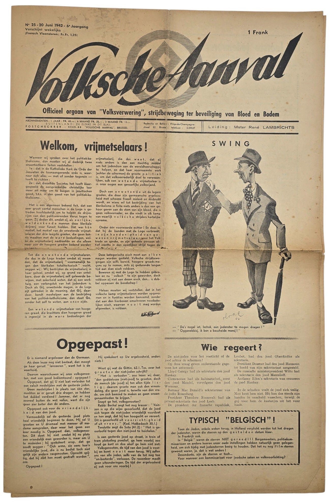Original WW2 Flemish Collaboration Antisemitic Newspaper - Volksche Aanval 6th year No. 25, Volksverwering (1942)Antisemitic newspaper ''Volksche Aanval'' by the Flemish antisemitic action group Volksverwering led by René Lambricht. This newspaper is a Flemish variant of the German Der Stürmer by Julius Streicher. From 1942, they published lists of names and addresses of Jewish inhabitants in Belgium, to get them arrested, deported, and then murdered.Fragile on the folds.Originele Wo2 Nederlandse Collaboratie Antisemitische Krant - Volksche Aanval 6de Jaargang No. 25, Volksverwering (1942)De antisemitische krant ''Volksche Aanval'' werd uitgegeven door de Vlaamse antisemitische actiegroep Volksverwering onder leiding van René Lambricht. Deze krant is een Vlaamse variant van de Duitse krant Der Stürmer van Julius Streicher. Vanaf 1942 publiceerden ze lijsten met namen en adressen van Joodse inwoners van België, met als doel hen te laten arresteren, deporteren en vervolgens te laten vermoorden.Fragiel op de vouwen.