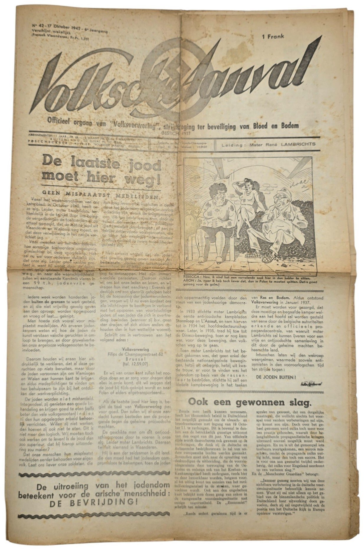 Original WW2 Flemish Collaboration Antisemitic Newspaper - Volksche Aanval 6th year No. 42, Volksverwering (1942)Antisemitic newspaper ''Volksche Aanval'' by the Flemish antisemitic action group Volksverwering led by René Lambricht. This newspaper is a Flemish variant of the German Der Stürmer by Julius Streicher. From 1942, they published lists of names and addresses of Jewish inhabitants in Belgium, to get them arrested, deported, and then murdered.Fragile on the folds. Stained.Originele Wo2 Nederlandse Collaboratie Antisemitische Krant - Volksche Aanval 6de Jaargang No. 42, Volksverwering (1942)De antisemitische krant ''Volksche Aanval'' werd uitgegeven door de Vlaamse antisemitische actiegroep Volksverwering onder leiding van René Lambricht. Deze krant is een Vlaamse variant van de Duitse krant Der Stürmer van Julius Streicher. Vanaf 1942 publiceerden ze lijsten met namen en adressen van Joodse inwoners van België, met als doel hen te laten arresteren, deporteren en vervolgens te laten vermoorden.Fragiel op de vouwen. Vlekkig.