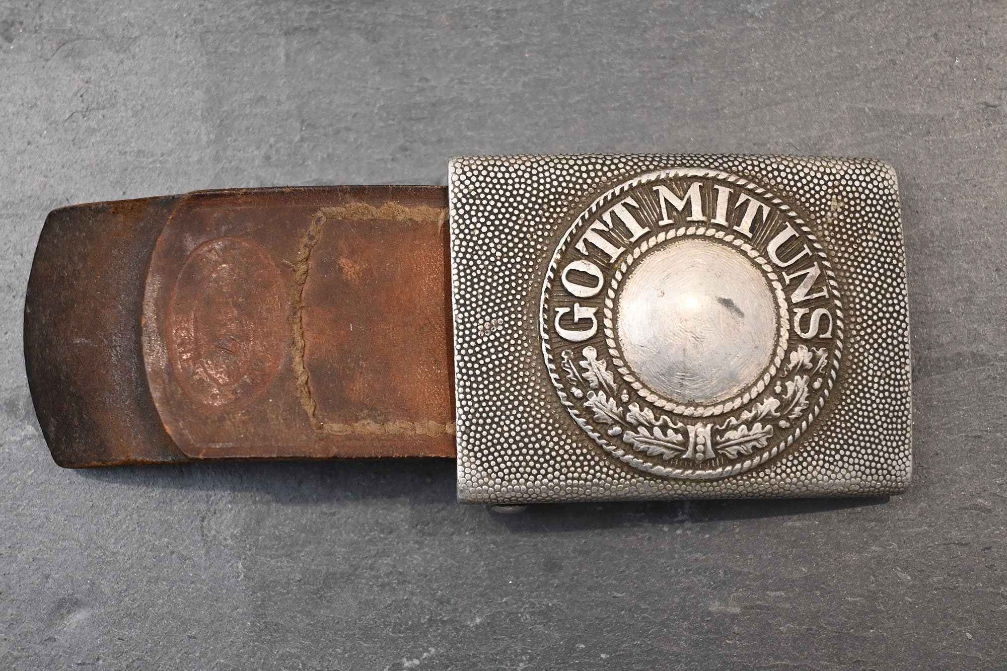 Aluminum Wehrmacht belt worn after the war, so the eagle with the swastika was filed out. Leather strap dated 1937.