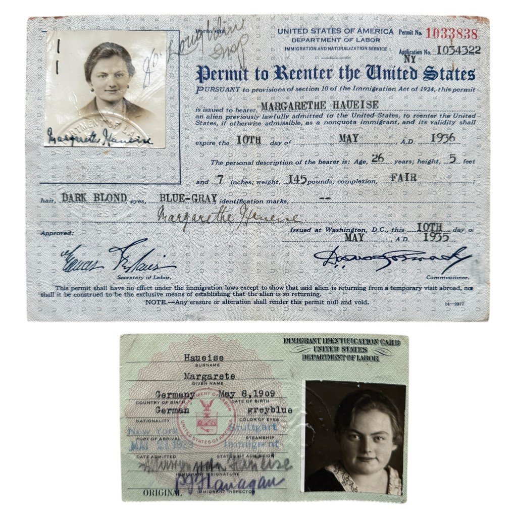 This exceptional set consists of original American immigration cards in the name of Margarethe Haueise and offers a fascinating insight into the migration history of the 1930s.The set includes, among others, an Immigrant Identification Card and an official Permit to Reenter the United States, complete with period photographs, stamps, and signatures.What makes these documents particularly special is their historical timing.They date precisely from a period of political tension in Germany, just before Hitler's rise to power in 1933 and in the midst of the flight of German migrants.Many German citizens fled the country during this period due to rising anti-Semitism and mass unemployment.As such, they reflect not only a personal life story, but also a crucial moment in European and American history.The cards illustrate how strict and bureaucratic migration once was, while also showing how people nevertheless tried to build a new life under difficult circumstances.A unique set for collectors, museums, or enthusiasts of migration history from the period just before the Second World War.Article number: 18092Originele 1929–1936 US immigratie kaarten van Duitse vluchtelingDeze bijzondere set bestaat uit originele Amerikaanse immigratie kaarten op naam van Margarethe Haueise en biedt een interessante inkijk in de migratiegeschiedenis van de jaren dertig. De set omvat onder meer een Immigrant Identification Card en een officiële Permit to Reenter the United States, voorzien van pasfoto's, stempels en handtekeningen uit die tijd. Wat deze documenten bijzonder maakt, is hun historische timing. Ze dateren precies uit de periode van politieke spanningen in Duitsland, vlak vóór Hitlers machtsovername in 1933 en midden in de vluchtperiode van Duitse migranten.Vele Duitse burgers ontvluchtte het land in deze periode vanwege het opkomende antisemitisme en de massale werkloosheid.Daarmee tonen ze niet alleen een persoonlijk levensverhaal, maar ook een cruciaal moment in de Europese en Amerikaanse geschiedenis. De kaarten tonen hoe streng en bureaucratisch migratie destijds was, maar ook hoe mensen ondanks alles een nieuw bestaan probeerden op te bouwen.Een unieke set voor verzamelaars, musea of liefhebbers van migratiegeschiedenis van vlak voor de Tweede Wereldoorlog.