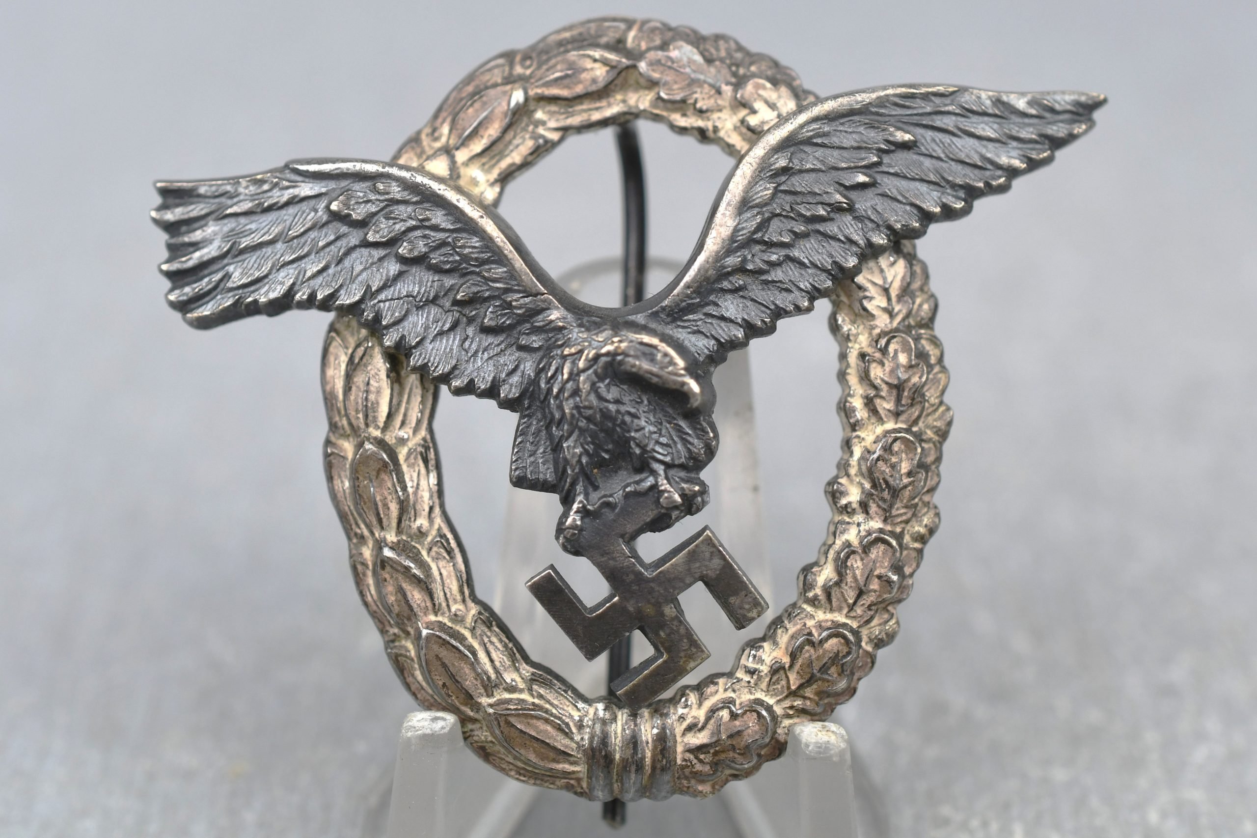 Luftwaffe pilot badge in silver by Brüder Schneider A.G., Wien (BSW). Tombak construction with rivetted tombak eagle. Maker marked on the reverse with the clover marking 'BSW' for 'Brüder Schneider A.G., Wien'. Very good c ondition with nearly all finish present. No repairs, no damage.