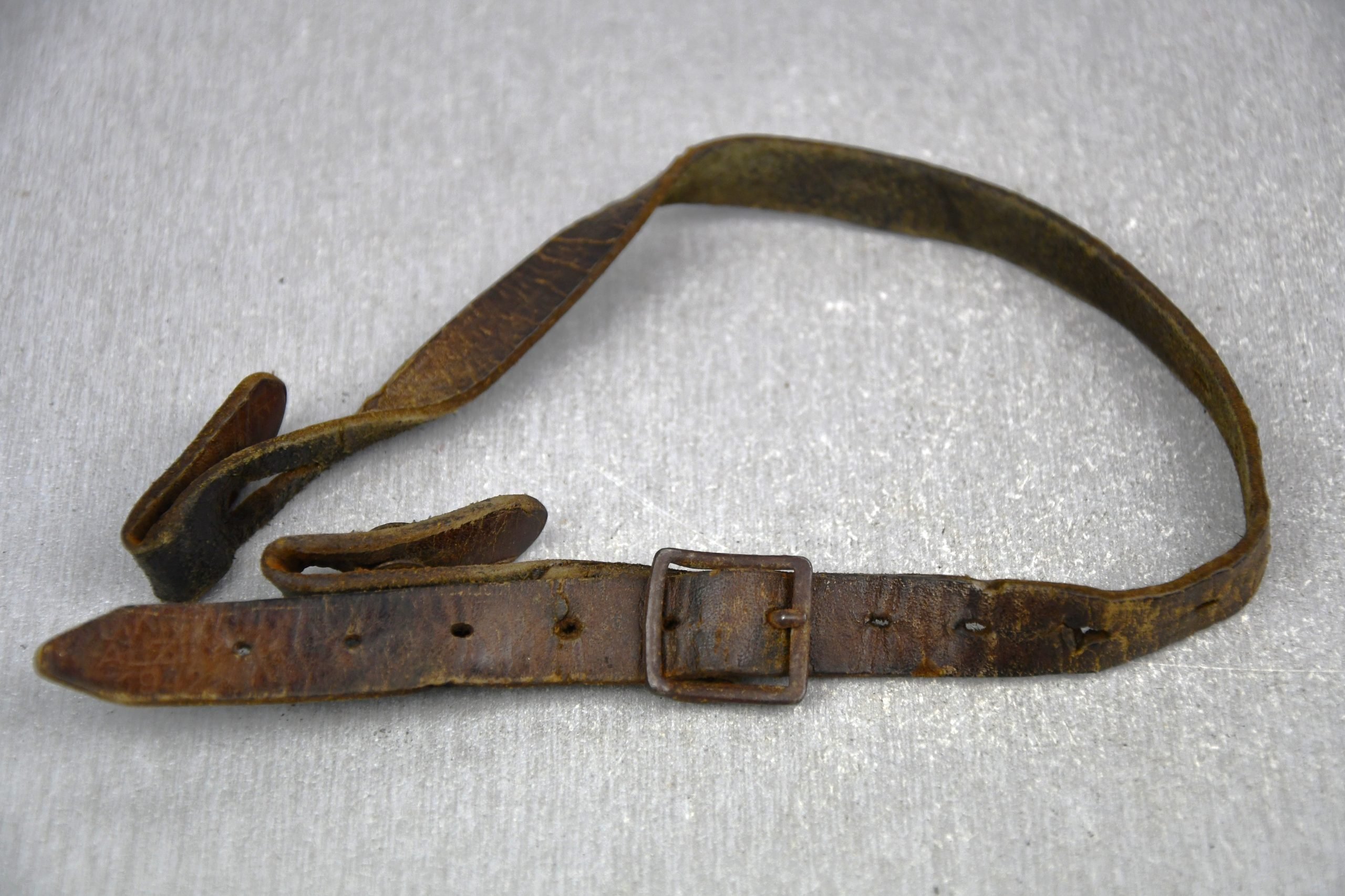 Genuine helmet chin strap in light worn condition. Steel buckle. Maker marked by Henseler & Co. in Ulm, I believe it's dated 1940