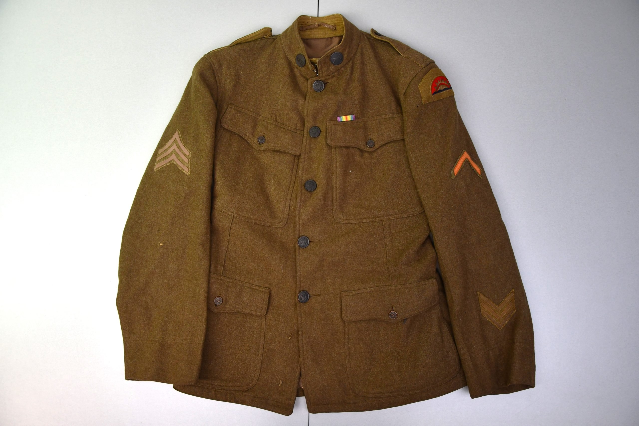 A good WW1 American four-pocket wool tunic, attributed to the41st Division.The tunic is fitted with American eagle tunic buttons and displays Infantry and 'US' collar discs.The sleeve bears a bullion wire 41st Division patch, with a bullion chevron and inverted lace chevrons to the lower arm, indicating enlisted service and time in uniform.Above the breast pocket is an Allied Victory Medal ribbon, adding to the period character of the piece.Overall in generally good condition, this is a solid and attractive example of a WW1 U.S. Army divisional tunic, suitable for display or collection.